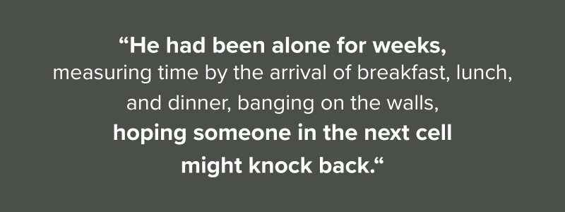 He had recently told his interrogator he would say whatever was needed. He had started begging the guard who slid the food tray under the door just to stop and talk to him.
