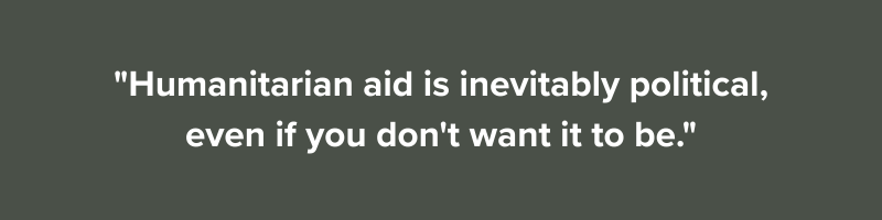 "Humanitarian aid is inevitably political," she says, "even if you don't want it to be."