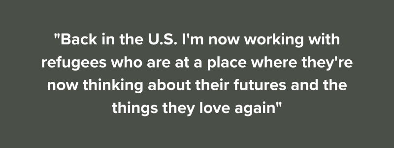 "Back in the U.S. I'm now working with refugees who are at a place where they're now thinking about their futures and the things they love again," she says, "which was so far from where they were when they were fleeing home. That gives me hope. There is so much beauty to discover in this world, right? They're adding so much beauty to their lives, my life, to our community, and I love that."