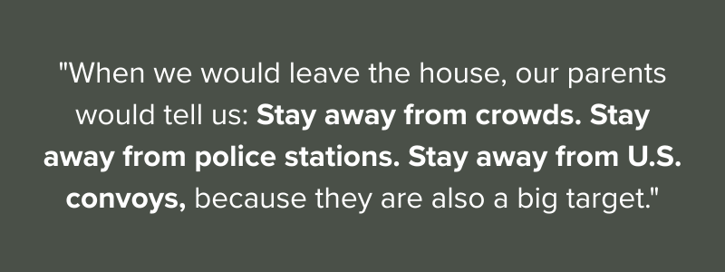 "When we would leave the house, our parents would tell us: Stay away from crowds. Stay away from police stations. Stay away from U.S. convoys, because they are also a big target."