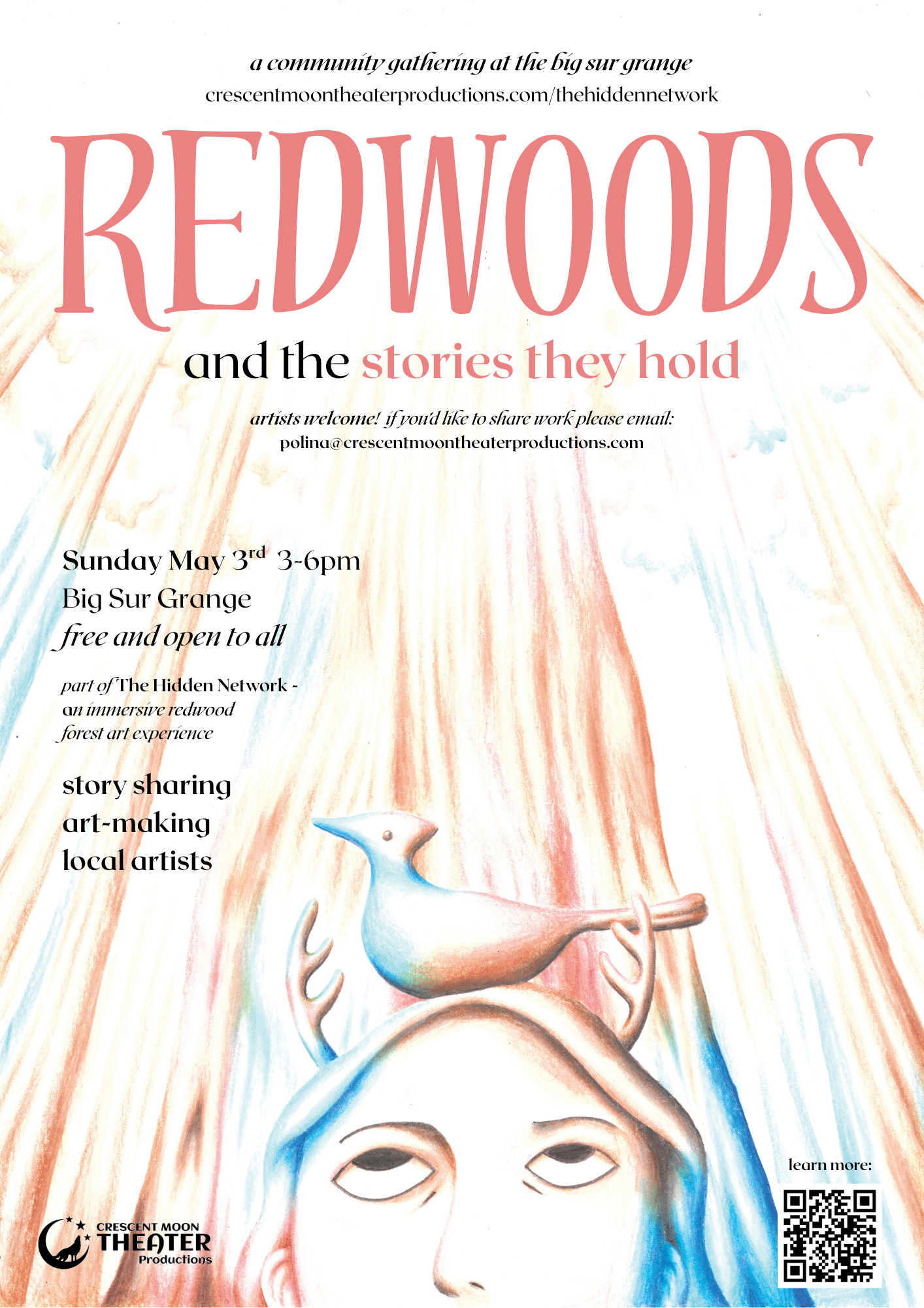 This gathering is part of The Hidden Network, an immersive redwood forest art experience by Crescent Moon Theater Productions. Blending an audio walking tour with live performances, it features voices from ecologists, wisdom keepers, artists, and community members. Live performances begin in 2027.