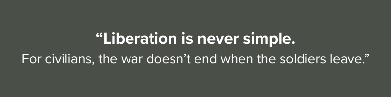 That night changed his view of war. “Liberation is never simple,” he says. “For civilians, the war doesn’t end when the soldiers leave.”
