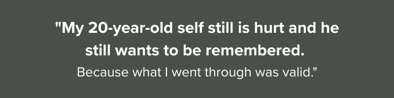 "My 20-year-old self still is hurt," he says, "and he still wants to be remembered. Because what I went through was valid."