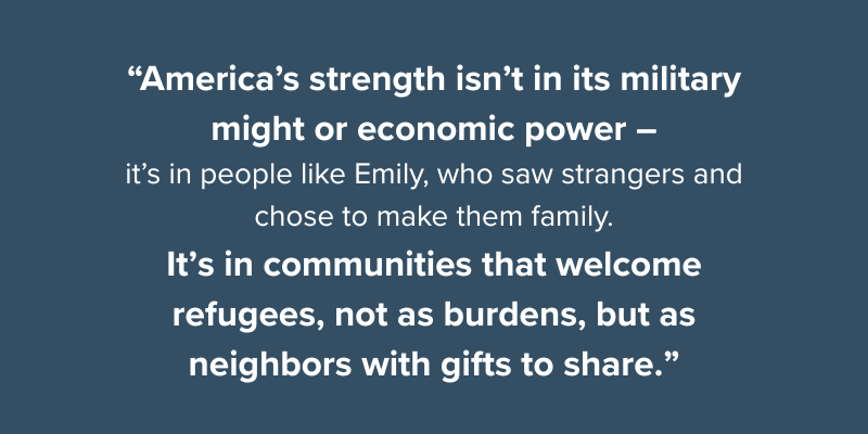 “America’s strength isn’t in its military might or economic power, it’s in people like Emily, who saw strangers and chose to make them family.”