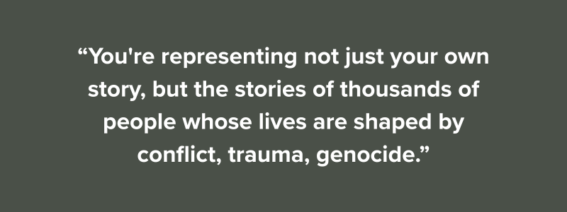 "You're representing not just your own story, but the stories of thousands of people whose lives are shaped by conflict, trauma, genocide. But then you're the only one who gets the chance. Because there's not a million stages for people."