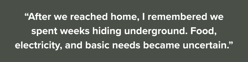 “There was chaos in the city; everyone was running towards their homes, so scaredly, while running home, the firing was ongoing. I saw women and children running away in fear and panic to reach their homes or a safe place. After we reached home, I remembered we spent weeks hiding underground. Food, electricity, and basic needs became uncertain. We were hearing the firing very nearly. No one was allowed to get out. Rockets hit homes near us.”